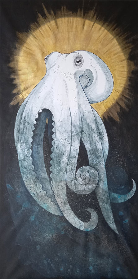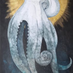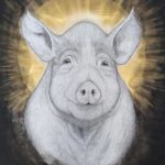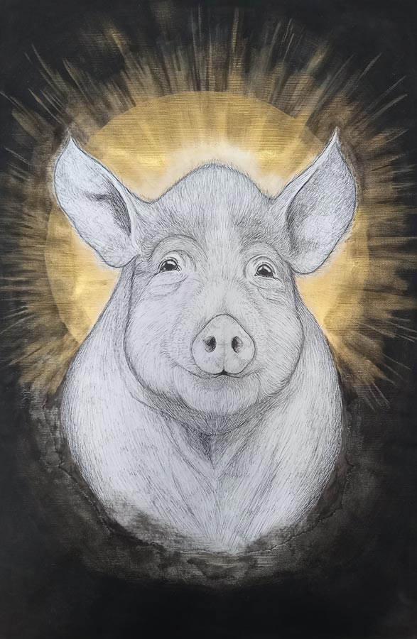 Plasticienne et artiviste, Willène Pilate réalise des portraits d’animaux avec des compositions symboliques fortes. Chaque œuvre est le visage d’une personne animale, auréolée d’or, rappelant les icônes religieuses. Ces personnes animales sacrées sont accompagnées de textes racontant leur condition d’existence et d’exploitation.