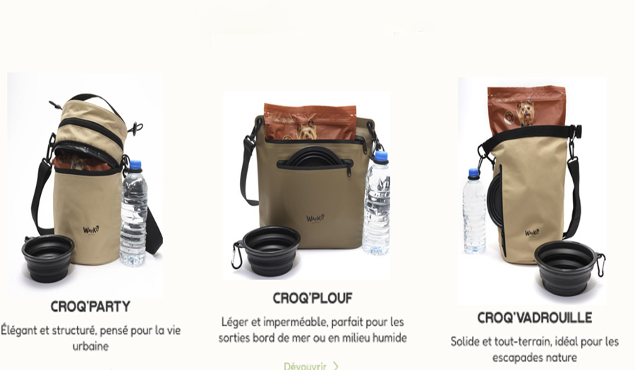 Le produit phare de la marque, le Croquy’Bag, est un sac 3-en-1 pensé pour accompagner toutes les aventures — du quotidien aux vacances. Il réunit en un seul objet un compartiment pour croquettes ou sachets, deux gamelles pliables intégrées et un porte-bouteille nomade. Compact, waterproof et facile à nettoyer, il s’adapte aussi bien aux balades citadines qu’aux randonnées ou aux séjours en plein air.