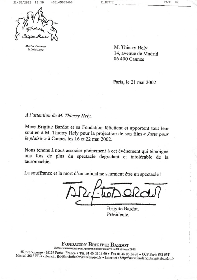 Par conséquent, Brigitte Bardot renonça à venir défendre ce terrible court-métrage tourné à Béziers en 2000 qui l’avait horrifiée. Sans cette remise de prix, compte tenu de sa notoriété, la cause anticorrida aurait eu un retentissement mondial ! Parmi les personnalités présentes, Jeanne Augier, PDG et propriétaire du Negresco. Elle osa afficher pendant 9 mois un panneau anticorrida de 4m par 3 devant son palace.
