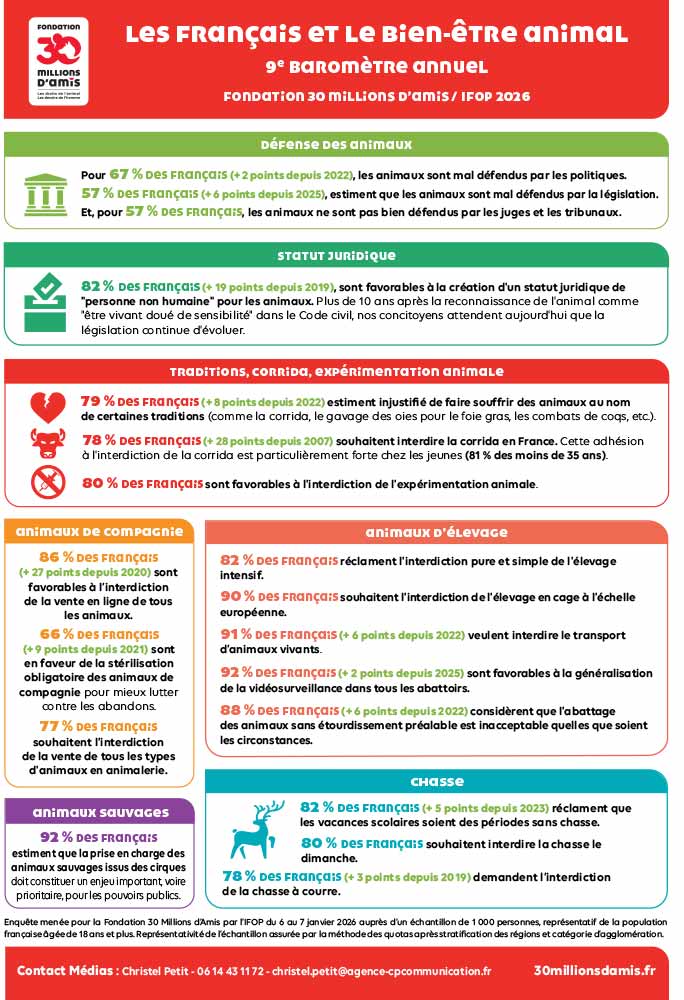 [1] Enquête « Les Français et le bien-être des animaux » menée pour la Fondation 30 Millions d’Amis par l’Ifop du 6 au 7 janvier 2026 auprès d’un échantillon de 1000 personnes, représentatif de la population française âgée de 18 ans et plus, représentation de l’échantillon assurée par la méthode des quotas.
